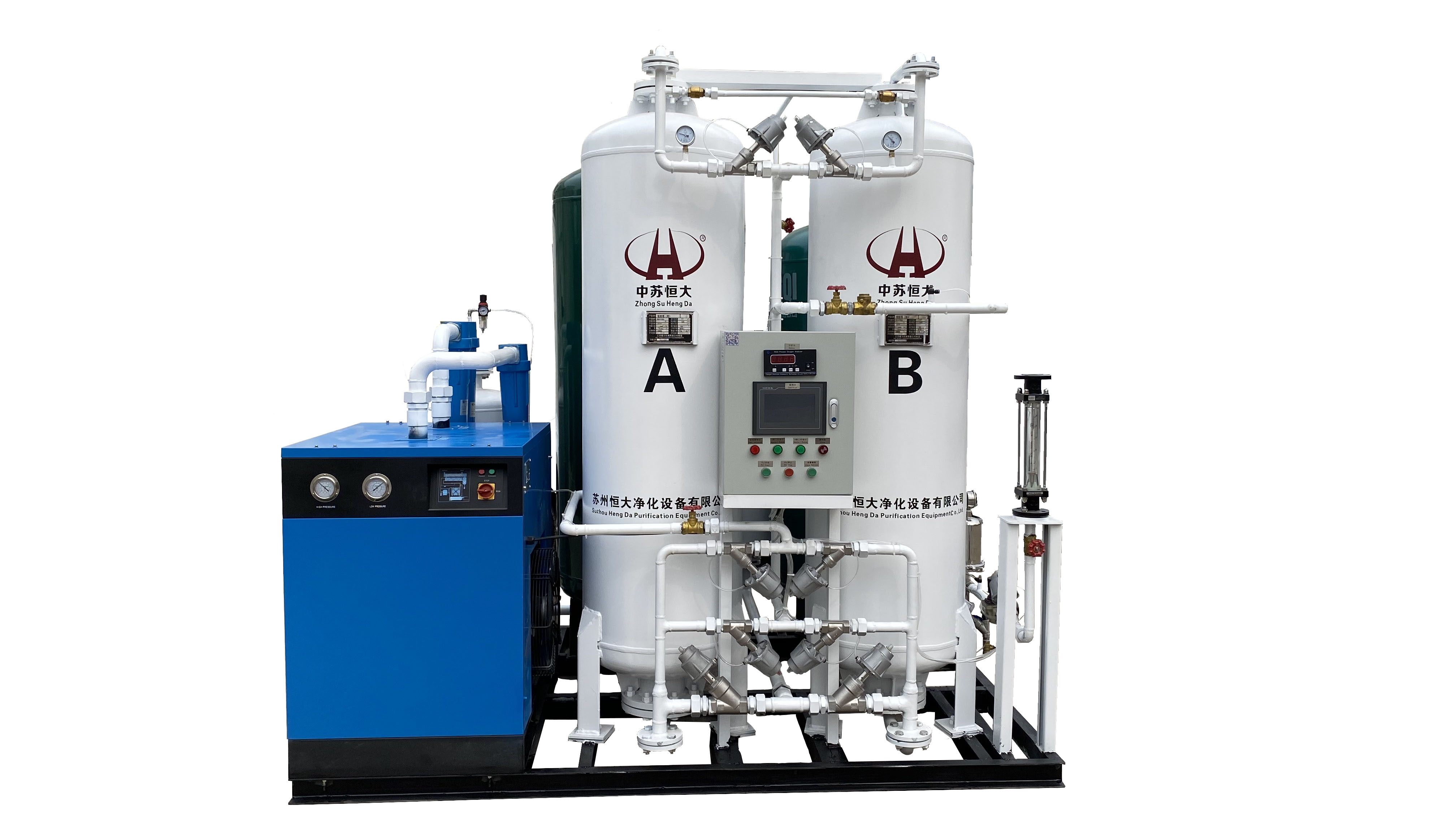 PSA制氮机是根据变压吸附原理,采用高品质的碳分子筛作为吸附剂,在一定的压力下,从空气中制取氮气。经过纯化干燥的压缩空气,在吸附器中进行加压吸附、减压脱附。由于空气动力学效应,氧在碳分子筛微孔中扩散速率远大于氮,氧被碳分子筛优先吸附,氮在气相中被富集起来,形成成品氮气。然后经减压至常压,吸附剂脱附所吸附的氧气等杂质,实现再生。今天我们来谈谈引起制氮机纯度下降的原因及解决方法。